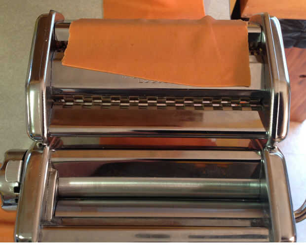 Fije la forma deseada y el tamaño del rodillo de pasta y masa a través de la alimentación, captura de acabado pasta con mano libre como emerge. Repita amasando y rodando con trozos de masa reservados.