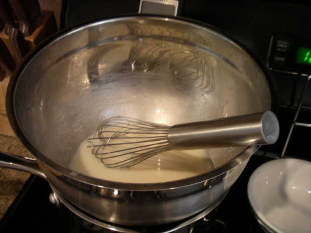 Derretir los chips de chocolate blanco con mantequilla, mitad y mitad y la vainilla extracción a baño María sobre fuego medio. Bata hasta que el chocolate se derrita totalmente. Agregue el licor de chocolate blanco. Apagar el fuego y deje que la salsa para calentarse en baño María.