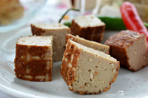 Si no puede encontrar tofu ahumado con almendras y semillas de sésamo se puede utilizar algún otro queso de soja, estoy seguro de todavía buen gusto! Fríe los cubos en aceite de oliva hasta que se tornen doradas.