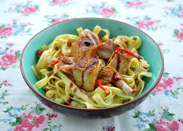 este plato relativamente sencillo preparar ofrece un sabor sorprendentemente vigoroso y una mezcla de texturas.Paso 1: ingredientes 12 oz de su pasta penne favorito (sin gluten utilizado aquí)1 libra de su carne favorita (solomillo aquí)2 tazas de ch