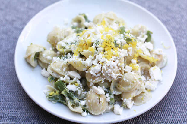 Pasta con espárragos, limón y queso Feta