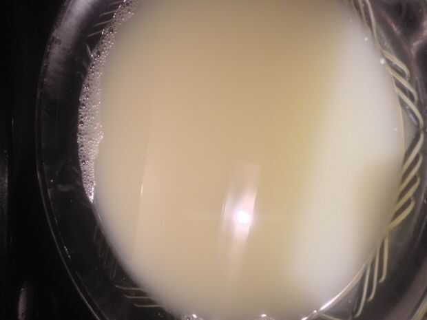 Suavemente y cuidadosamente vierte la cuajada en el colador forrado. Es muy caliente y el suero amarillento se verterá primero y luego la cuajada blanca caerá en el recipiente. No quemarse.