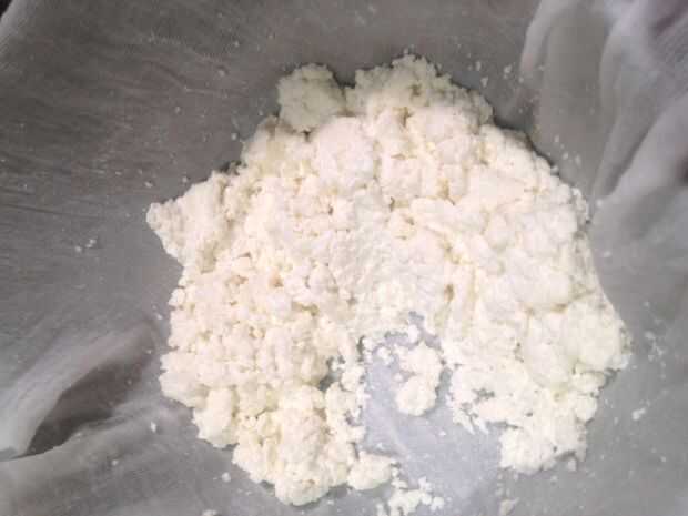 Que tenga puesto el colador sobre otro recipiente o pote que termine de drenar si el primer tazón de fuente es demasiado completo. Usé una cuchara para girar suavemente la cuajada para drenar tanto líquido como pude. Escurrir la cuajada durante 15 minutos o hasta que la cuajada ha alcanzado la consistencia de puré húmedo. Se muestran fotos de la cuajada y suero.