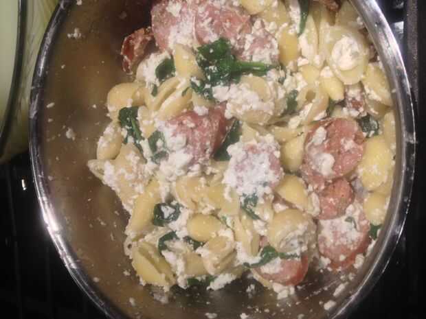 Calienta algunos precocinado Salchicha italiana y rebanadas en rondas y agrega a la olla junto con un puñado grande de espinacas baby frescas. Revuelva a fuego hasta que se ablande la espinaca.