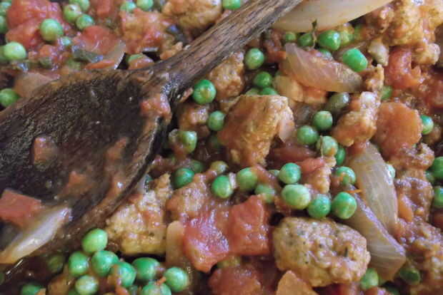 Pasta con salchicha, cebolla caramelizada, petit pois, hinojo semilla y pecorino sardo (6 / 8 paso)