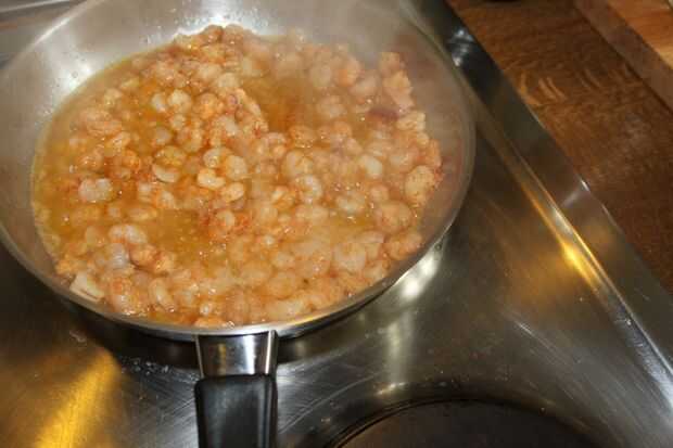 Caliente el aceite en una sartén revuelva freír cebollas finamente cortados hasta el color dorado, luego echar los langostinos y seguir revolviendo de vez en cuando a fuego lento. Primero cocinado en una olla y se dio cuenta de que una sartén es mejor, por lo que transfieren en a una sartén. Luego añadir el polvo de la paprika, comino y sal al gusto. THS ha de ser bien cocinado hasta que esté un poco seca en consistencia.