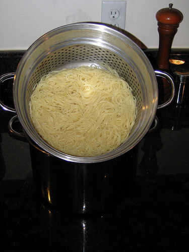 Retire la pasta del fuego y tomar en el fregadero. Añadir 1 taza de agua fría a la olla y escurrir inmediatamente en un colador. Devolver la pasta a la olla.