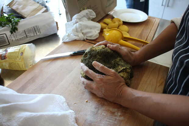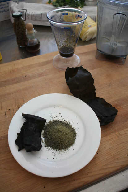 Para agregar las algas, hemos probado dos maneras diferentes. En primer lugar, hemos mezclado las hojas secas en una especie de polvo y espolvoreado en que mezcla. La otra forma fue añadir las algas al agua luego añadir esto a la masa. La única diferencia notable es que es más verde.