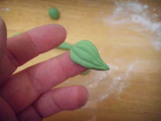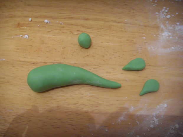 Ruede la bola grande en forma de lágrima alargada. Dividir una de las bolas más pequeñas en 2 y hacer 2 pequeñas gotas de lágrima.