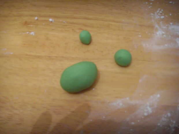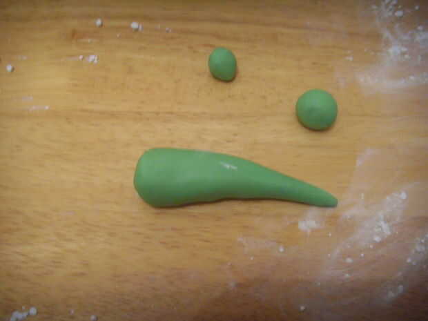 Cola - rodillo uno grandes y 2 pequeñas bolas de pasta verde.