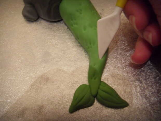 Con la punta de su herramienta de modelado, marca pequeños grupos de 'escalas' toda la cola (también puede usar una herramienta de sonrisa en forma de curva, si tiene uno).