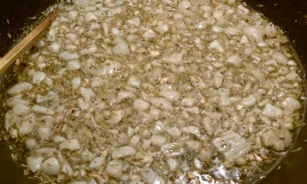 Arrojar un puñado de aceite de canola en una sartén grande y echar la cebolla y el ajo en la parte superior. Gire el calor hasta un 80%. Añadir 1.5ml Romero y el tomillo de 1,0 ml. Las cebollas y especias comenzará a crepitar y olor deliciosos como los mezcle. Manténgalos a fuego, revolviendo de vez en cuando [4] para evitar que se adhiera a la cacerola, hasta que comiencen a caramelizar. Caramelizar es indicada por las cebollas girando un poco marrón y vertiendo su olor fuerte acetileno a favor de un tono más mantecoso.