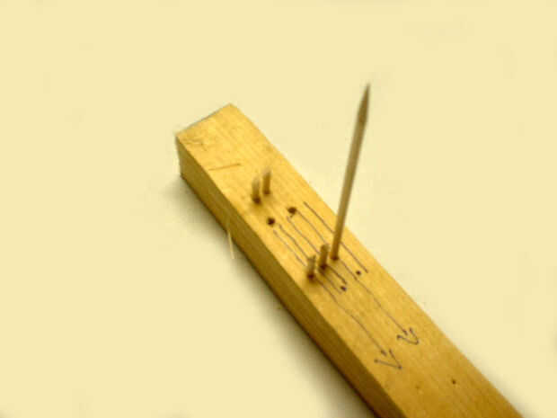 Palillos (2mm) fueron insertados en estos orificios, formando una plantilla con la que forma la carpintería