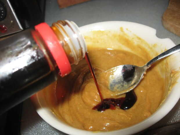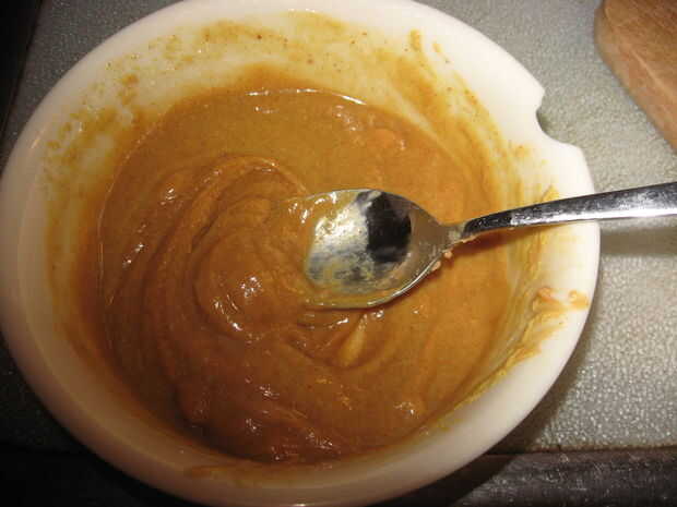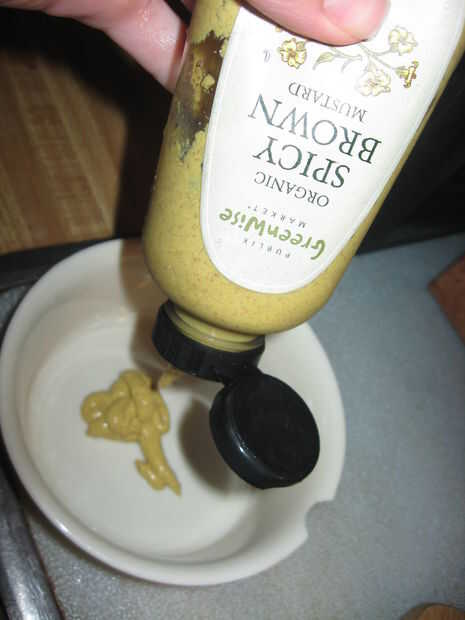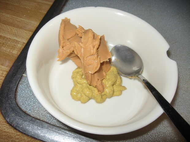 A continuación, agregue una cucharada o dos de mantequilla de maní en la taza con la mostaza. Yo prefiero usar mantequilla de cacahuate que no ha sido endulzada. Deben leer los ingredientes de maní, sal y posiblemente petróleo (como la mantequilla de maní que utiliza). Grueso y suave mantequilla de maní funcionan perfectamente bien. Usar lo que tienes.