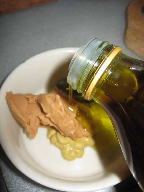 Tome unas gotas de aceite (yo usé aceite de oliva) y verter lentamente en la mantequilla de maní y mostaza mientras se mezcla con una cuchara hasta que la mezcla alcance una consistencia cremosa. Realmente no se necesita mucho aceite.