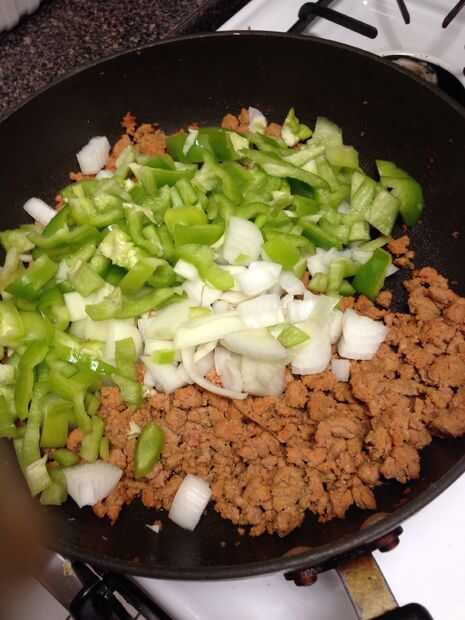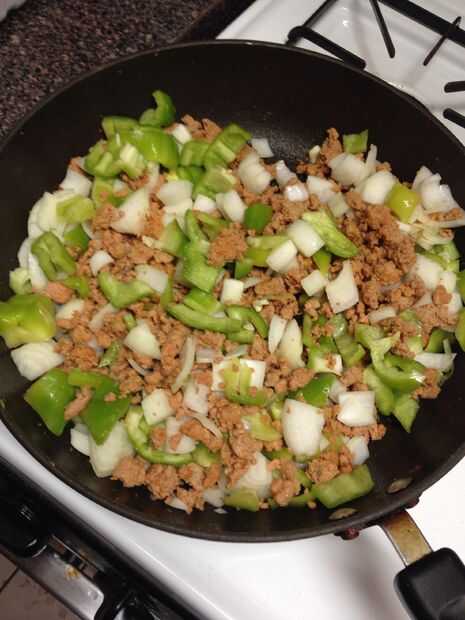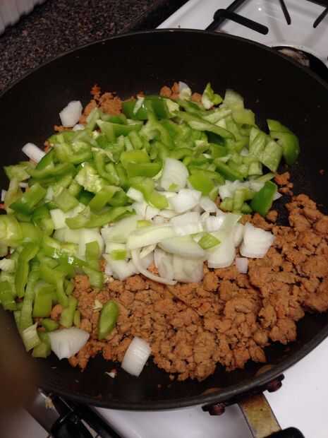 Corte 2 pimientos y 3 cebollas en pedazos uniformes pequeños y mezclar con la carne molida