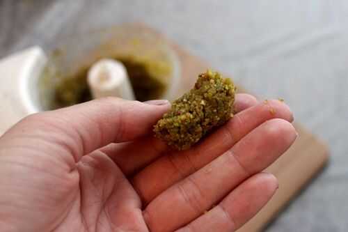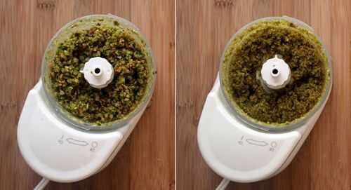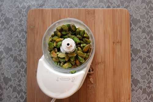 Pistachos tienen menos aceite que otras tuercas, por lo que la textura del pistacho de tierra solo será un poco quebradiza, sobre todo si no aprieta mientras está todavía húmedos de ebullición. Eso está totalmente bien. Su pasta, por lo menos en este punto, debería verse un poco algo así como la última foto.