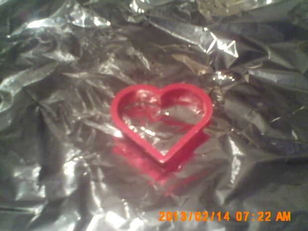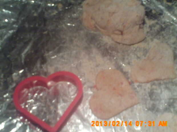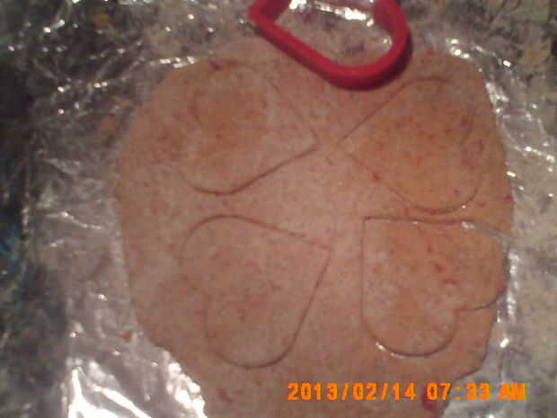 Después de que la masa ha reposado, poner sobre una superficie ligeramente enharinada. Rollo hasta muy fina pero no pegajosa. (añada harina según sea necesario). Utilice su cortador de galletas en forma de corazón para cortar las piezas de pasta. Puede enrollar la pasta sin utilizar de más formas de corazón.