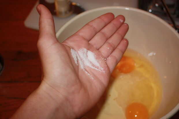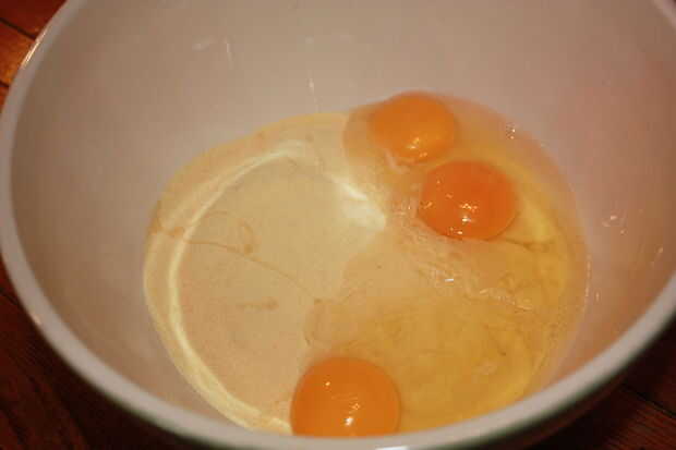 En un medio a un tazón grande, agregue las dos tazas de harina, tres huevos y la pizca de sal y aceite de oliva.