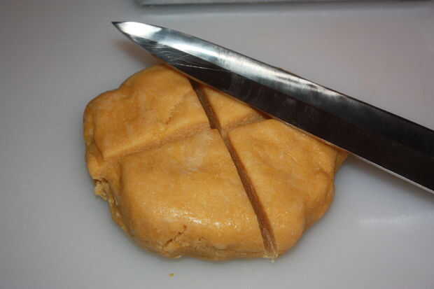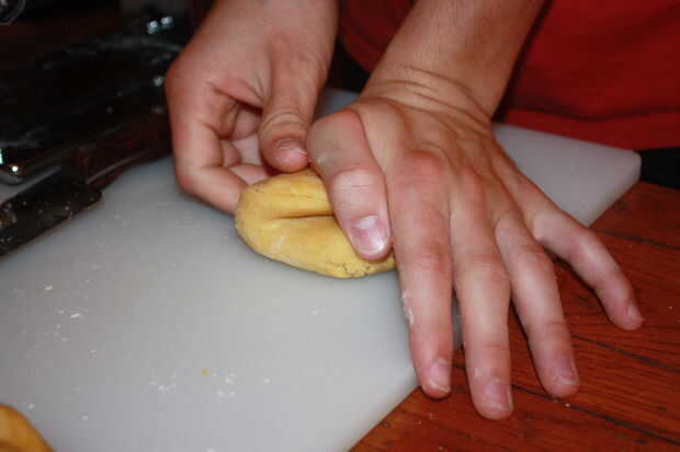 Después de que la masa ha reposado en el frigorífico durante una hora, sacar y quitar la envoltura plástica. Coloque la masa en la placa de corte que se ha cubierto ligeramente con harina regular (no sémola) y luego usando un cuchillo de corta la tortita gruesa en cuartos. La masa debe ser mucho más flexible y fácil de trabajar que antes de que se coloca en el refrigerador. La masa será probablemente un poco seco, pero si no, ignore este paso. Con el vaso de agua a temperatura ambiente, Mójese las manos y comenzar a amasar uno de los barrios. Menos agua es mayor. Tarda casi no hay agua para mejorar la consistencia de masa. Después de agregar el agua, amasar cada sección de la masa de no más de treinta segundos a un minuto. Poner en la máquina de pasta hará el resto.