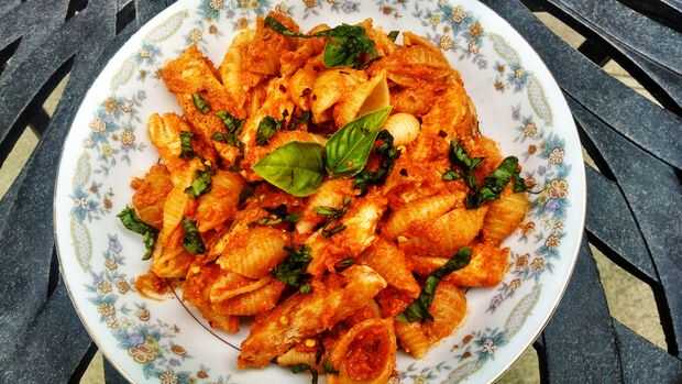 el sol tomates secos añaden un complejo sabor ahumado a cualquier salsa para pasta. Mezclándolos con pimientos rojos, plato quince minutos sabe a fue lento a fuego lento sobre la estufa durante horas.Con sólo cuatro ingredientes de la salsa, este pla