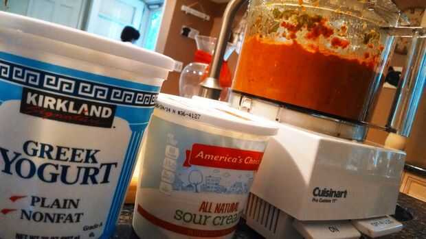 Debe ser bastante espesa. Luego continuar a añadir 2 cucharadas de yogur griego y crema agria.