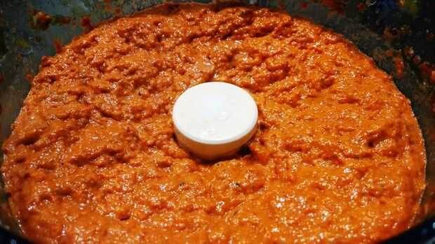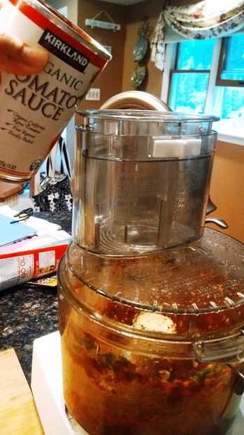 Empezar a mezclar. Mientras licuar agregar aceite de oliva, salsa de tomate y un poco de agua caliente hasta que es el espesor deseado.