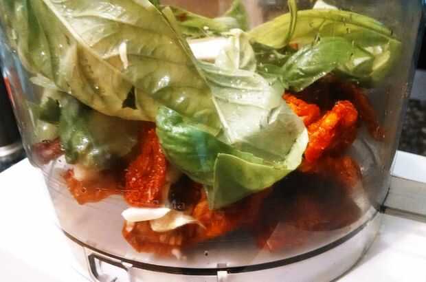 Empezar por pechugas de pollo marinadas durante al menos 2 horas en su aderezo italiano favorito. Agarrar el procesador de alimentos y en aproximadamente 2 tazas de tomates secados al sol, una mano llena de albahaca fresca y unos 6 dientes de ajo.