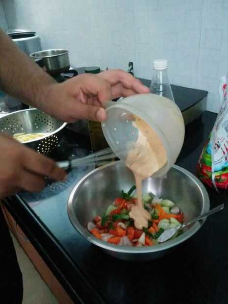 Mezclar los ingredientes húmedos con pasta y las verduras.