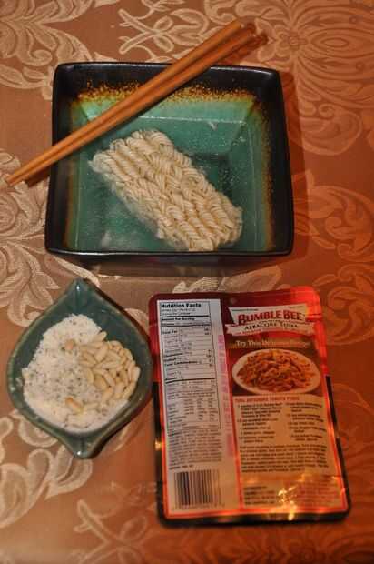 Llevar el agua a hervir y luego retirar del fuego. Agregar Ramen al agua y dejar establecido por 3 Min o hasta que estén suaves (Ramen completamente es cocido antes de es empaquetado para vender así cocción de los fideos no es necesario). Después de 3 Min o fideos en la suavidad deseada derramar casi toda el agua (deje lo suficiente para absorber los ingredientes secos sobre una cantidad de una cuchara de mesa). Mezclar bien los ingredientes secos y atún.