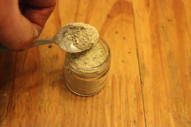 Para conservar todas las virtudes de los ingredientes que necesita para almacenar este polvo en un recipiente seco lejos de la luz. Utilicé una jarra de mermelada reciclado hotel y Andy me hizo un anillo de madera de palet. Un recipiente oscuro de vidrio o china haría muy bien.