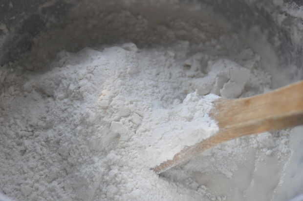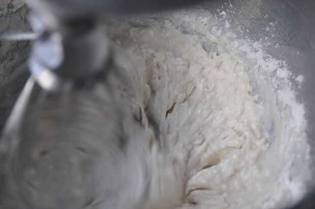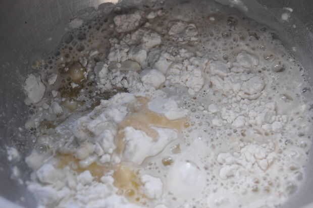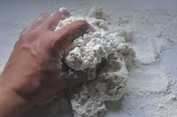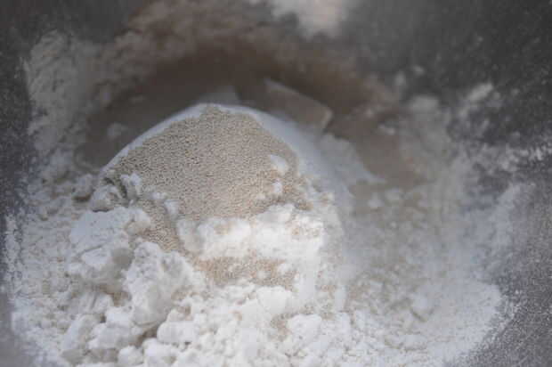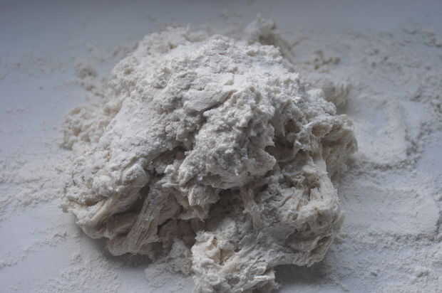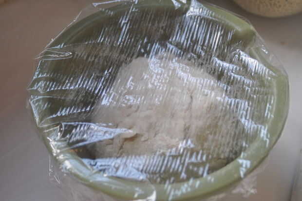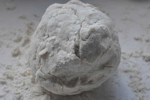 A continuación, preparar una superficie por limpiar y cubrir ligeramente con harina. Amasar la masa para un poco hasta obtener una masa agradable que es suave y elástico, pero tipo de rigidez. Si quieres hacer dos pizzas pequeñas, ahora es el momento para dividir la masa en dos mitades separtate. Luego cubrir la masa durante unos 10 minutos.