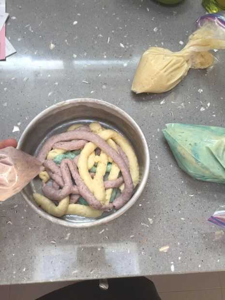 Cuando la masa en bolsas, cortar las puntas de 1/2 pulgada de. Alternando bolsas, exprimir alguna masa alrededor de la cacerola y continuar haciéndolo hasta que usted ha utilizado encima de la masa. Utilizar un cuchillo liso por la parte superior y bang el pan de pastel sobre la mesa un par de veces para eliminar cualquier burbuja de aire.