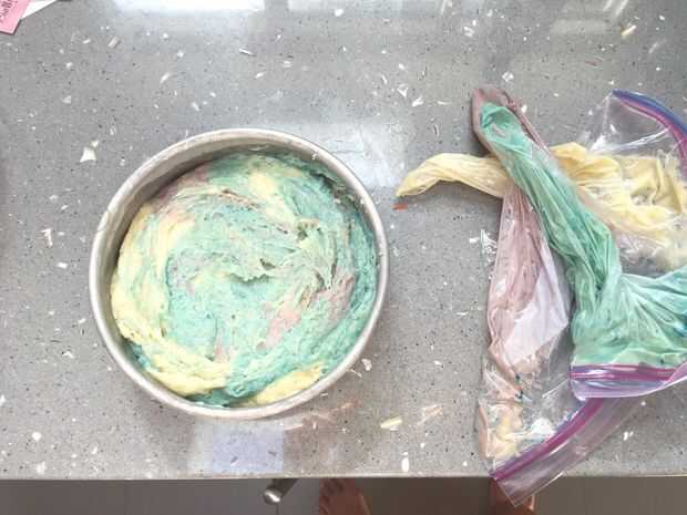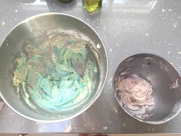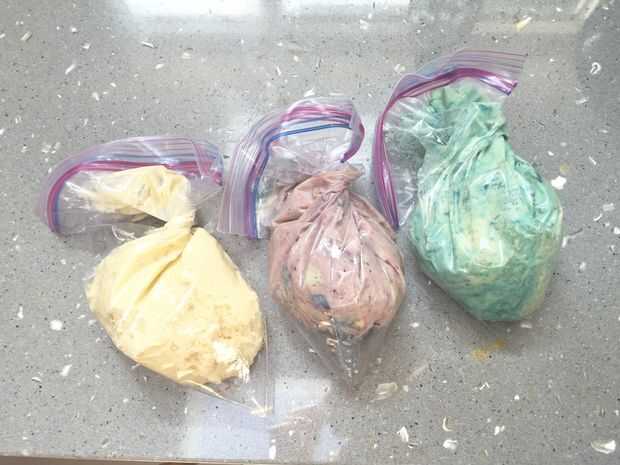 Ya sólo quería color 2/3 de mi masa, recogió un poco de la mezcla en dos cuencos diferentes y el último tercio de la masa en una bolsa ziploc *. Una vez terminé las otras secciones de la mezcla del colorante, los en bolsas ziploc, también recogió torciendo los extremos para que la masa me alojé en.