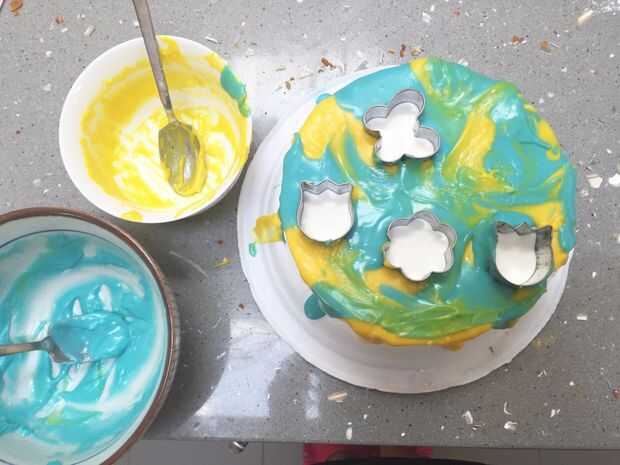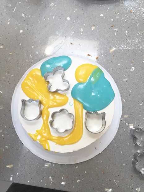 Retire el pastel del refrigerador. Si lo desea, coloque algunos cortadores de la galleta encima de tu pastel donde gustaría mantener simple. Trabajo algo rápidamente, Vierta cucharadas de chocolate derretido sobre el pastel dejando algún goteo hacia abajo de los lados. Usando la parte trasera de una cuchara o una espátula de goma, agitar los colores para crear un bonito patrón.