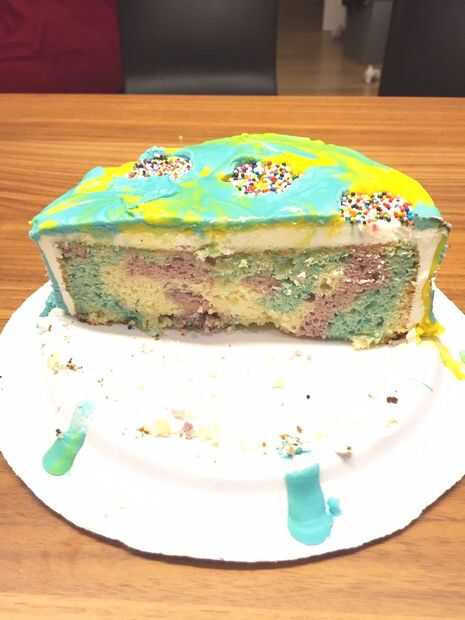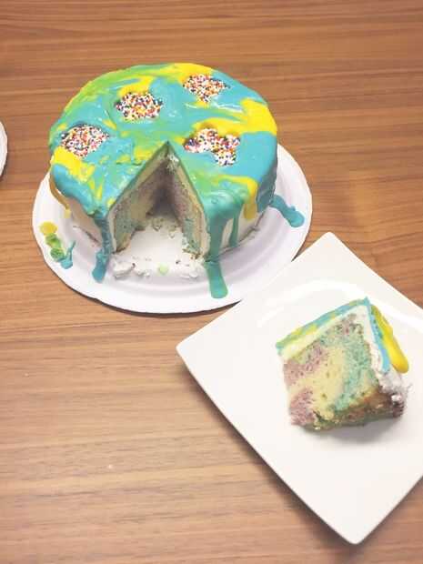 etapas para hacer un pastel de arco iris con diferentes colores louisePaso 1: hacer las tortas mezcla de pastel de 8 oz igualmente se dividen en 5 tazones de fuente y agregar todos los coloresPaso 2:Vierta en la bandeja y hornear durante 10 a 15 minu