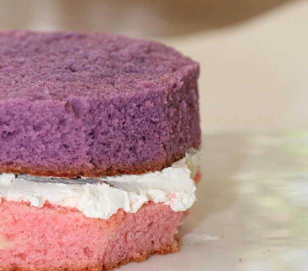 Comienza a apilar cada una de las capas de arco iris de pastel añadiendo una capa de helar o mantequilla crema entre cada capa.
