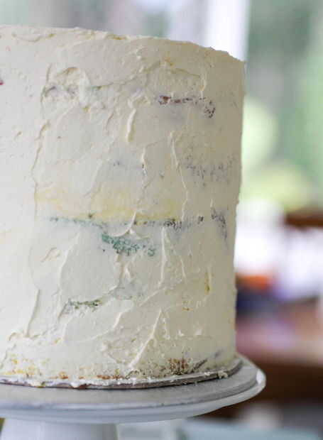 Una vez que la capa final de pastel rosado es propagación fría y una fina capa de crema alrededor de los bordes de la mantequilla y el pastel tan suave como sea posible. Bien tan suave como sea posible sin ir por la borda recuerda que será un montón de volantes que cubren este pastel. Enfriar el pastel otra vez hasta que la crema esté firme.