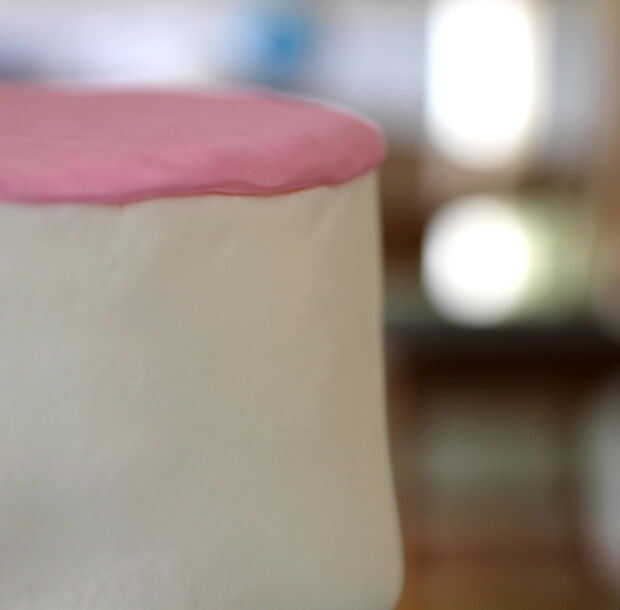 Tomar el fondant rosa y rodar hacia fuera en un banco de trabajo espolvoreado de maicena (almidón de maíz) hasta que es muy delgada y utilizando la lata de pastel que usaste para cocer las tortas en prensa hacia abajo para cortar una ronda el tamaño aproximado de la torta. Colóquelo encima del pastel y usar los pulidores de fondant para hacer la parte superior lo más suave posible.