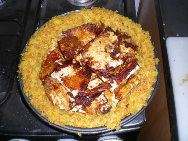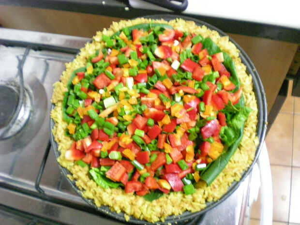 Tofu organizar sobre el arroz, luego una capa de espinacas. Mezclar el pimiento rojo, cebolleta y guindilla y añadir como una capa en la parte superior.