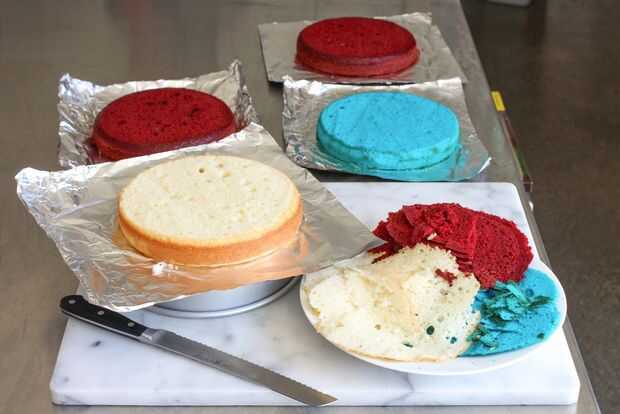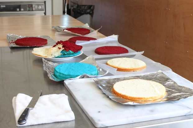 Cuando todo está ajustado y hecho, usted debe dejarse con un conjunto azul pastel, dos capas de pastel blanco y cuatro capas de pastel rojo.