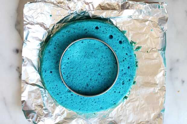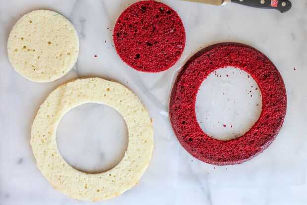 Cortar el centro de una blanca capa, una capa roja y luego azul pastel.