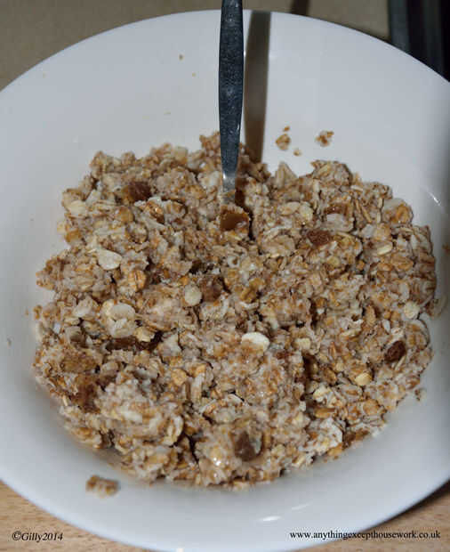 Después de empapar durante la noche, el muesli debe haber hinchado y estar lo suficientemente húmeda para un tenedor hacer frente directamente en él sin caerse.