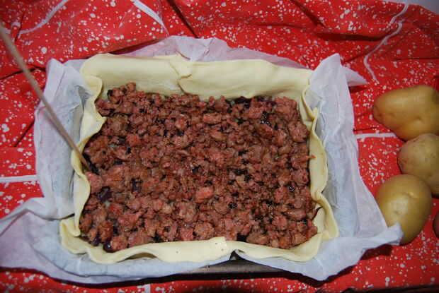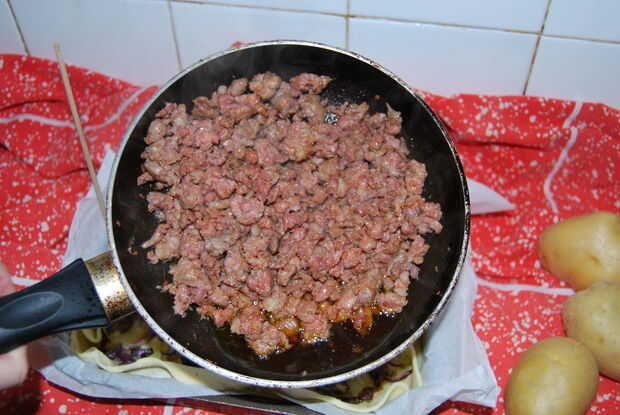 Tomar la piel de las salchichas, si es necesario, y cocinar en la misma sartén que has usado para las cebollas y añadir una pizca de sal. Cuando las salchichas estén listas, agregarlos a las papas y las cebollas, separarse de la misma manera.