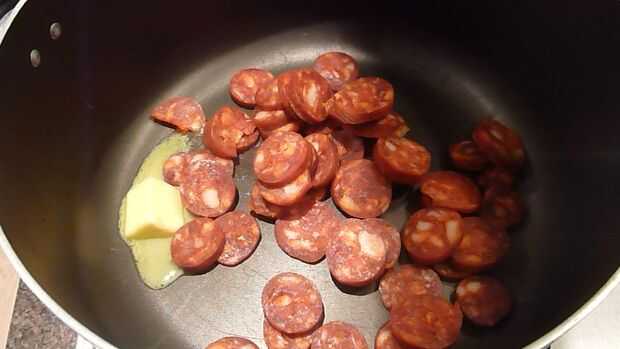 Freír el Chorizo con la mantequilla en sartén grande de fondo. Foto 2