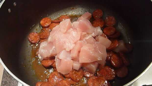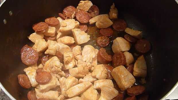 Es el momento ahora para añadir el pollo y dejar cocinar con el Chorizo. Cuadro 4