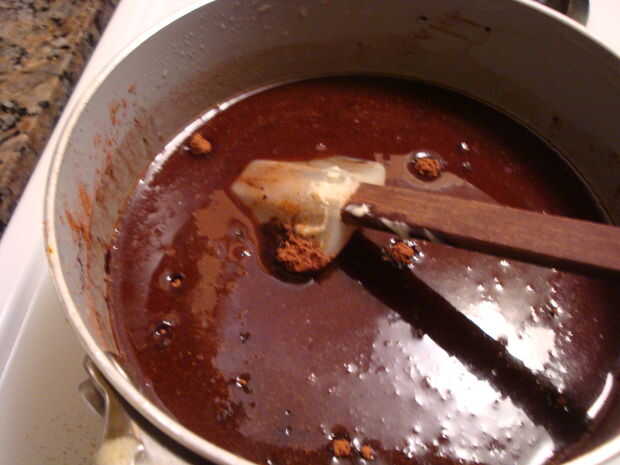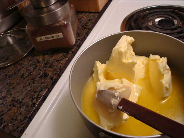 En una cacerola mediana, derrita mantequilla, el cacao y el Chocolate hasta que quede suave a baja temperatura. Una vez combinados, retirar del fuego. Ponga a un lado.