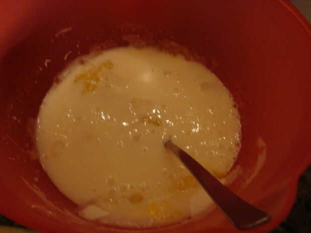 Mezclar huevos, azúcar, suero de leche y extracto de vainilla.