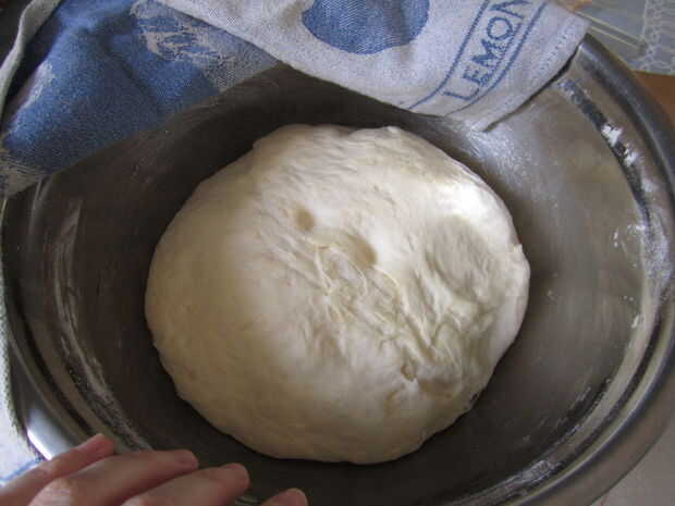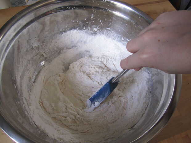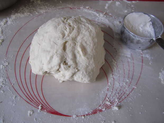 Vierta la levadura disuelta en un tazón grande, junto con la restante agua tibia 1 1/3 c., azúcar, sal, manteca y 2 tazas de la harina. Usando una batidora eléctrica, mezcla la masa hasta que quede suave. Con una cuchara, añadir en tanto las restantes 3 tazas de harina para hacer la masa fácil de manejar y no demasiado pegajosa.
