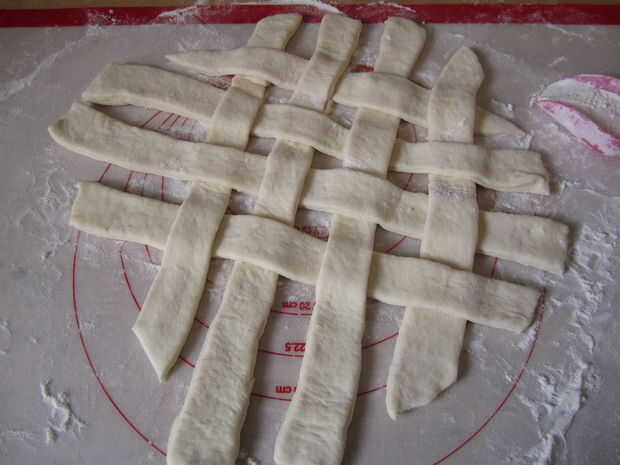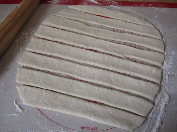Rodillo hacia fuera el pedazo más pequeño de la masa en 12" por 12" (30 x 30 cm) cuadrado y cortar en tiras de 1 pulgada. Estas tiras se utilizará para hacer una tapa de enrejado a la tarta una vez que se llena.